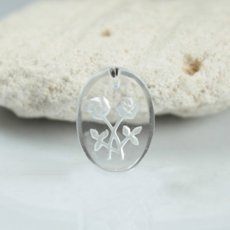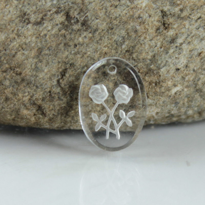Made in Germany. These pendants, also known as crystal painting pendants, or reverse carved pendants are miniature works of art. Each hand pressed glass piece features a smooth top through which you can see a detailed intaglio image, molded into the back of the stone. The intaglio carving is then painted or coated, and the surrounding surface is cut or polished to remove excess color and highlight the image.
