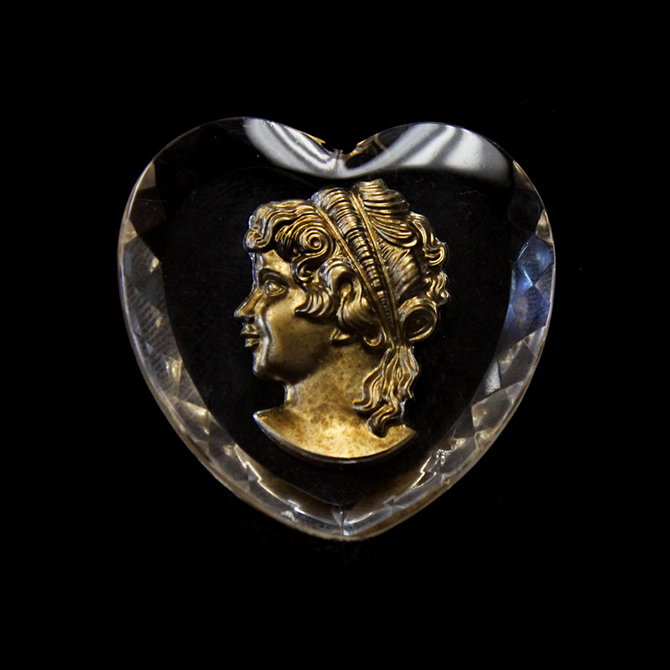 Glass Flat Back Reverse Carved Intaglio Back Woman's Head Left Facing Heart 35x34MM GOLD PAINTED on CRYSTAL