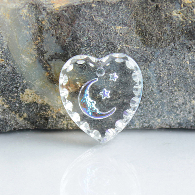 German Glass Engraved Buff Top Intaglio Pendant - MOON & STARS Heart 15x14MM CRYSTAL CRYSTAL AB