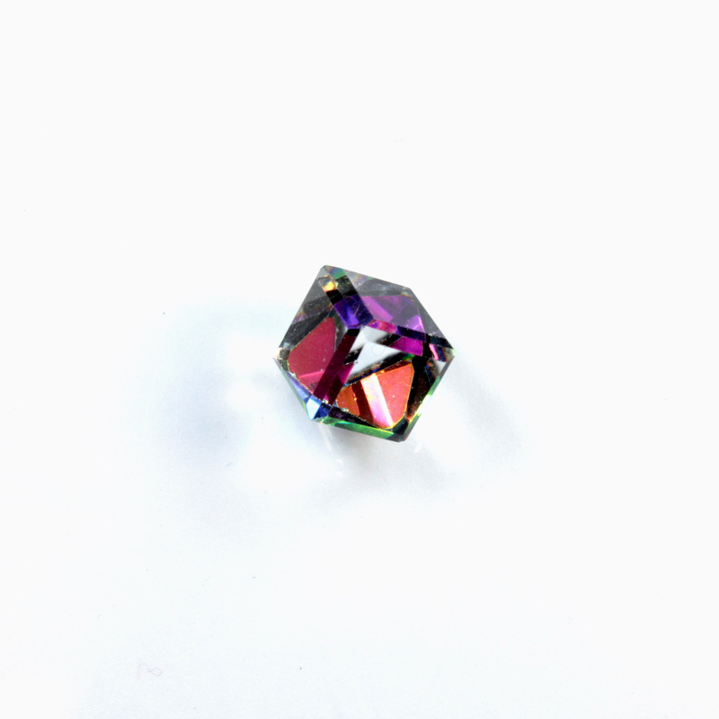 This 3/4 cut crystal cube is faceted with a small flat area underneath that allows it to be placed in a setting or adhered to any flat surface. Also known as an angled cube, this quality component from China is a cost-effective alternative to more expensive european stones.