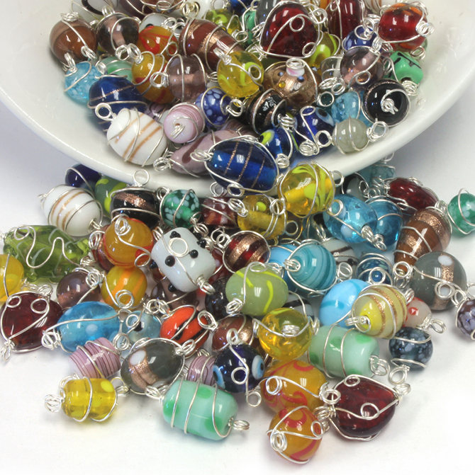 This glass pendant mix is loosely packed in quarter kilo bags. Each bag has an assortment of handmade pendants, Due to the wide size variance of the pendants, there are between 444 and 480 pieces per kilo. Beads WIre Wrapped with brass loops varying in shape and size. No two bags will have exactly the same mix and the quantity of beads per bag will vary slightly. Once each lot is gone, it's gone, so stock up now if you like these.