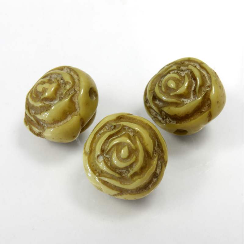 Plastic Engraved Bead - Flower Rose 16x13MM ANTIQUE LT OLIVE