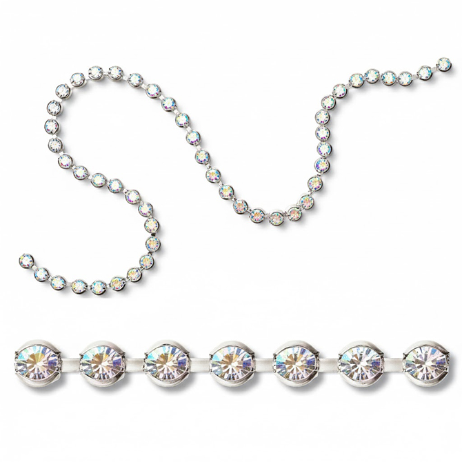 Sleek, strong, and endlessly versatile, Preciosa Bezelchain revolutionizes crystal chains. Think smooth silhouettes, effortless layering, and sparkle that never snags. Whether draped as jewelry, embroidered into apparel, or stitched across accessories, it delivers flawless fluidity. No pulling, no catching – just a sleek run of crystals that wears as smoothly as it shines.