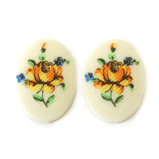 Made in West Germany. These vintage plastic decal stones have a textured fiinish making them look almost like cross stitch patterns. Also known as porcelain paintings and as cameo picture stones. Each flat back stone has a decal image applied to the top surface of a buff top cabochon base,. Due to their age background shadess may vary.