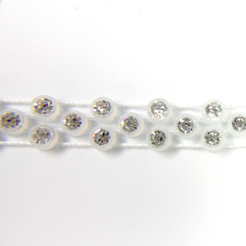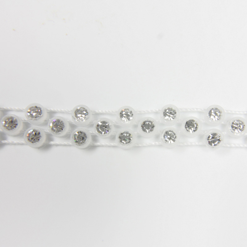 LIMITED STOCK Machine cut Preciosa Czech crystal chatons are cupped in durable, flexible plastic in this fancy flower trim. This innovative decorative banding makes a great accent for clothing, hats and jewelry. Sold in 10-meter spools, this banding can be sewn or glued on textiles and creatively incorporated into fashion accessories.