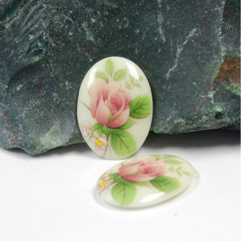 LIMITED STOCK. Made in Japan These vintage decal stones go by many different names. They are also known as porcelain paintings and sometimes as cameo picture stones. Each flat back stone has a decal image applied to the top of a smooth buff top cabochon base and then they are fired in a kiln oven for a long lasting result.