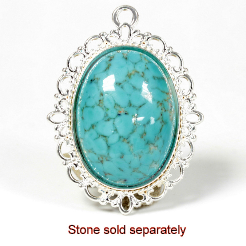 These metal alloy settings accommodate a 25x18mm oval cabochon or other flat back stones in that size. With a single loop, this setting can be attached to necklaces, and other parts of jewelry. Stocked in a plated metal finish, these are ready to use...just add stones, chain and imagination. Measures 39mm loop to end and 29mm side to side.