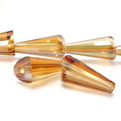 These cut crystal beads feature an elegant elongated tapered cone shape with a slightly rounded end. Stocked in a variety of visual effects these beads pop. Note: These beads have not been tested for lead and should not be used in products intended to be used by children