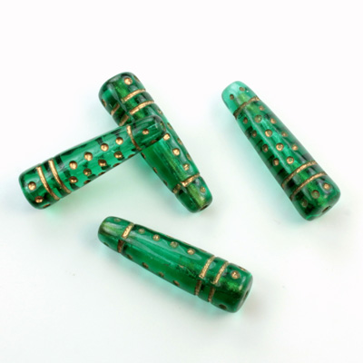 Czech Pressed Glass Engraved Bead - Oblong 23x7MM GOLD ON EMERALD