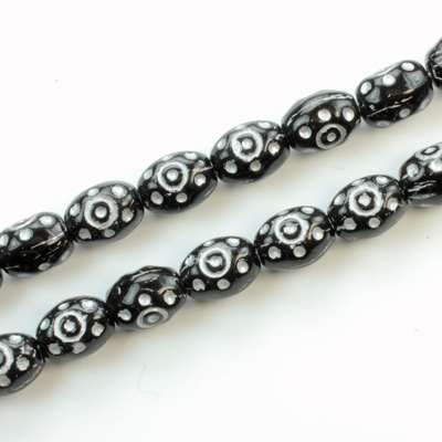 Czech Pressed Glass Engraved Bead - Oval 09x7MM SILVER ON JET