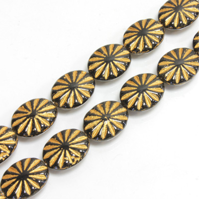 Czech Pressed Glass Engraved Bead - Oval 14x11MM GOLD ON JET