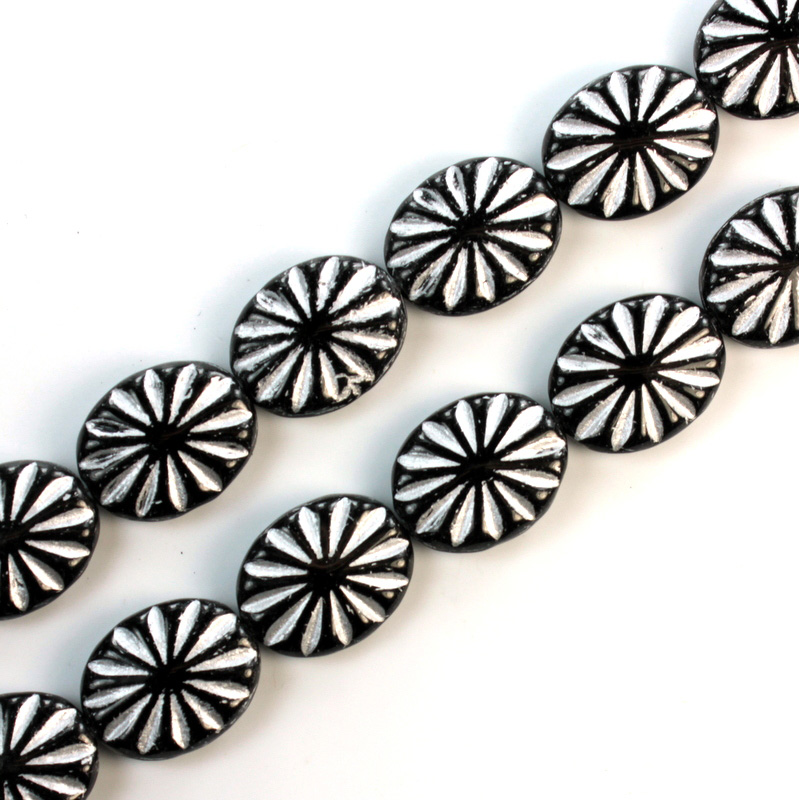 Czech Pressed Glass Engraved Bead - Oval 14x11MM SILVER ON JET