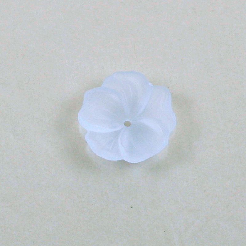 This 14mm German acrylic five-petal pansy shaped flower is slightly transparent with a matte finish. It features a small center hole and comes in a wide range of colors.