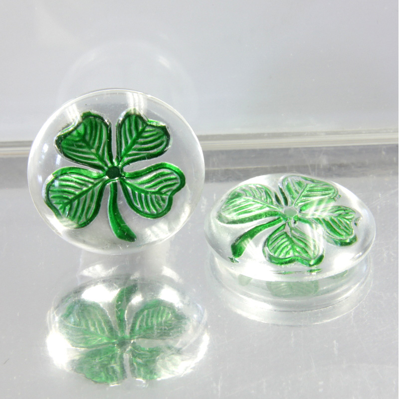 Made in Czech Republic, these reverse carved picture stones are miniature works of art. Known historically as crystal paintings, each of these glass crystal stones is hand pressed with a smooth domed top through which you can see a detailed intaglio image, molded into the back of the stone. The intaglio carving is then painted or coated, and the surrounding surface is cut or polished to remove excess color and highlight the image. Our FOUR LEAF CLOVER style has a natural green painted image on a clear crystal base. Due to the nature of these stone, Please take care when attaching, as the painted backs may be affected by different types of glue.