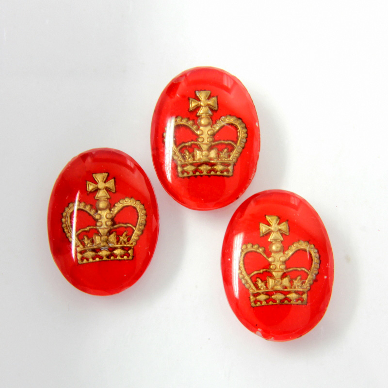 Made in Czech Republic, these reverse carved picture stones are miniature works of art. Known historically as crystal paintings, each of these glass crystal stones is hand pressed with a smooth domed top through which you can see a detailed intaglio image, molded into the back of the stone. The intaglio carving is then painted or coated, and the surrounding surface is cut or polished to remove excess color and highlight the image. This scene of a royal crown has a painted gold color image on a painted base. Due to the nature of these stone, please take care when attaching, as the painted backs may be affected by different types of glue.