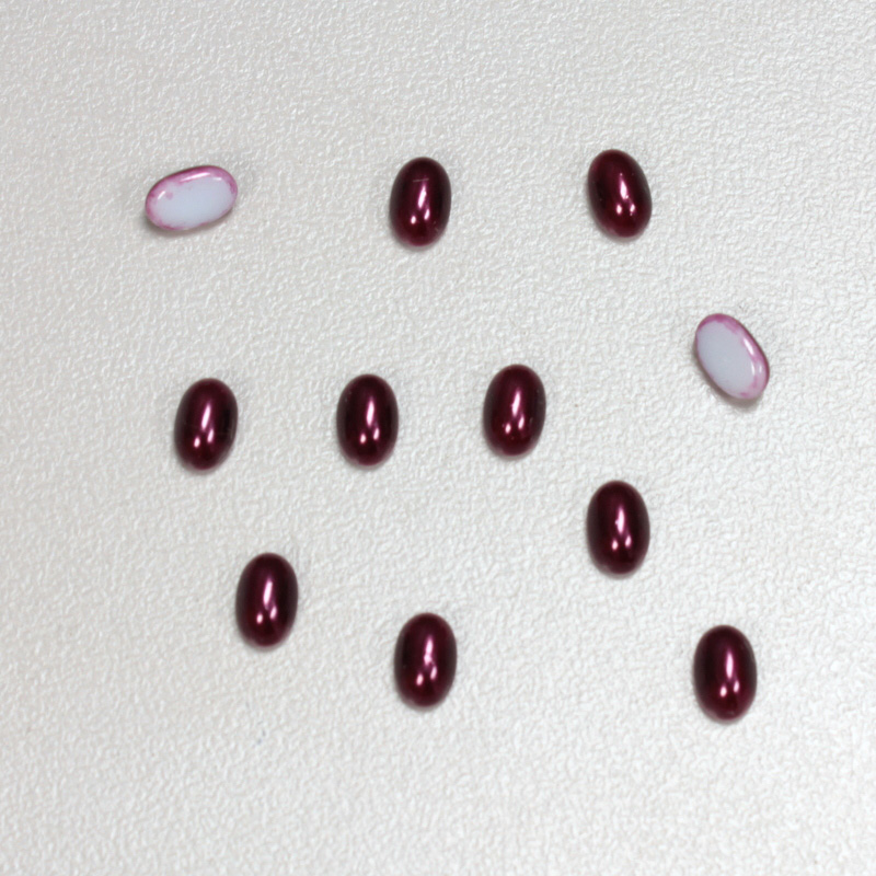 These small glass cabochons are too small for dipping, so a pearl finish is sprayed onto a lead-free alabaster glass base. Please note, pearl coatings can be affected by some types of chemicals and cosmetics.