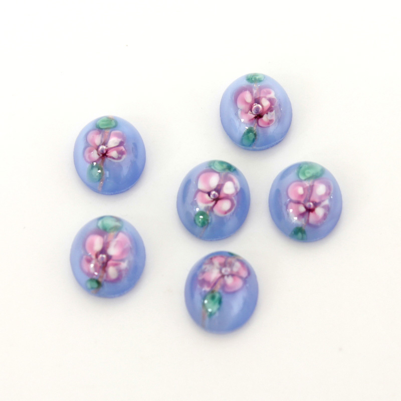 These lampwork glass cabochons are hand made and pressed with the same skills and techniques used for generations in the Czech glass lampwork industry. Each stone is a work of art as artisans mix the molten glass colors to create an inlay flower design within each stone. Available in a range of color combinations in Round and Oval shapes. Check out our line of inlay flower beads as well.