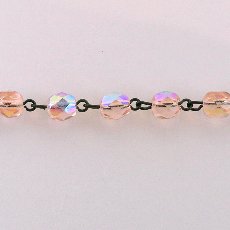 Our linked bead chain combines the beauty of our faceted Fire Polished Beads with hand linked jet black loops. Carried in convenient three foot sections, these chains are ready for use in your jewelry, home goods, or craft projects. Great for custom rosaries, necklaces, earrings, and more. Finish them off with a clasp, or use with a pendant or connector for other designs. Easy to use and versatile in look, these chains are among our most popular items.