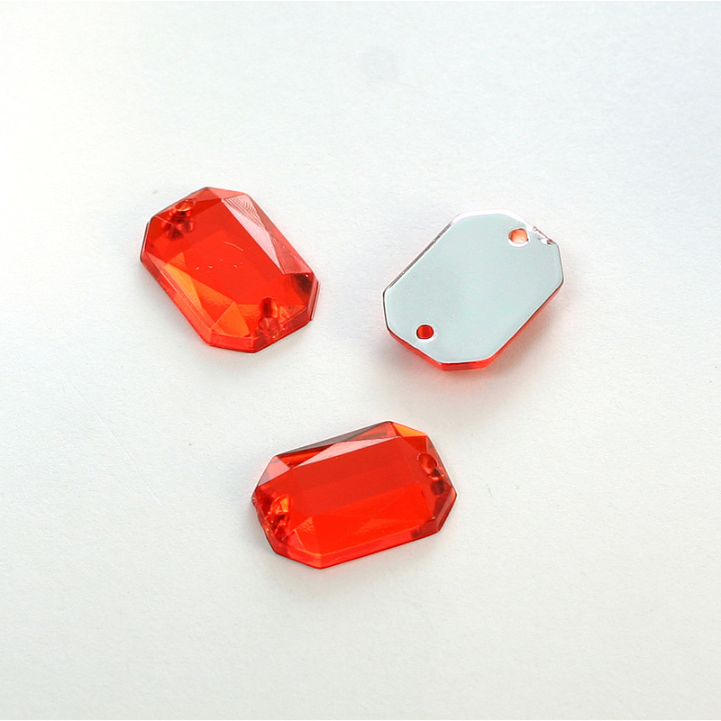 These acrylic sew-on jewel stones have a faceted top with two holes and a silver foiled reflective back. Also known as sew-on rhinestones, these come in a wide range of colors, shapes and sizes.