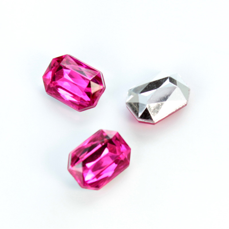 Our faceted acrylic point back stones are a great light weight, lead-free alternative to machine-cut crystal fancy stones. These top-quality lucite gemstones come in a variety of transparent jewel colors, with a silver foil backing. Be careful to use the correct glue when setting these stones. Glues which work well with glass stones may eat through or compromise the foil on plastic stones.