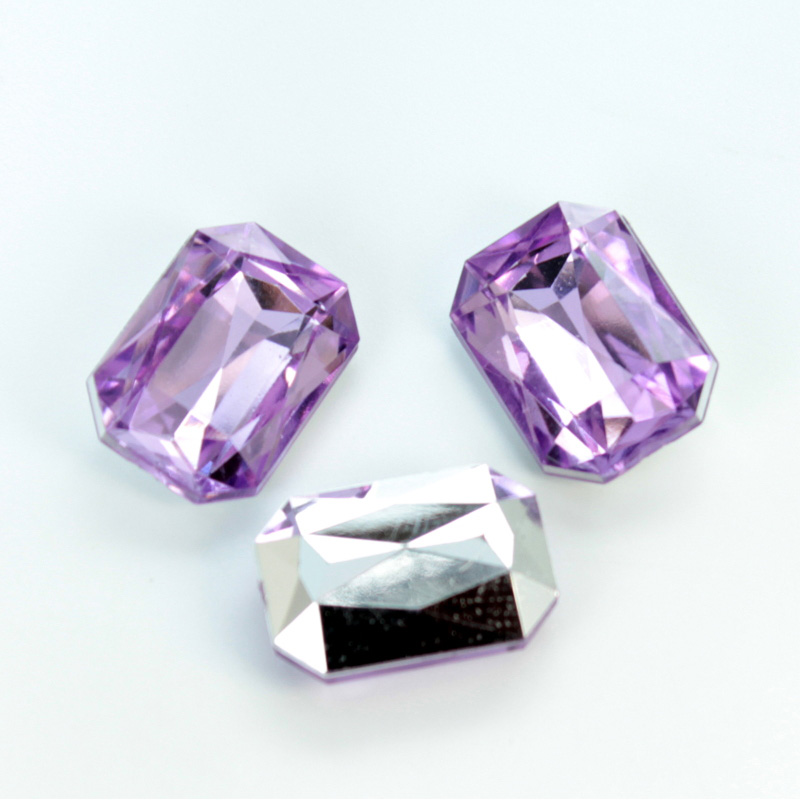 Our faceted acrylic point back stones are a great light weight, lead-free alternative to machine-cut crystal fancy stones. These top-quality lucite gemstones come in a variety of transparent jewel colors, with a silver foil backing. Be careful to use the correct glue when setting these stones. Glues which work well with glass stones may eat through or compromise the foil on plastic stones.