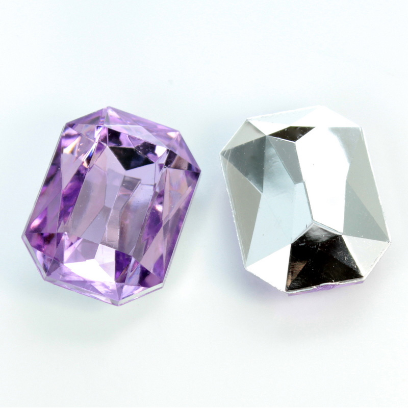 Our faceted acrylic point back stones are a great light weight, lead-free alternative to machine-cut crystal fancy stones. These top-quality lucite gemstones come in a variety of transparent jewel colors, with a silver foil backing. Be careful to use the correct glue when setting these stones. Glues which work well with glass stones may eat through or compromise the foil on plastic stones.