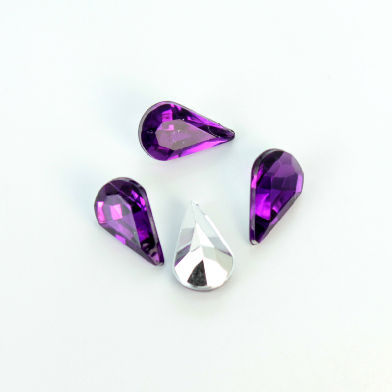 Our faceted acrylic point back stones are a great light weight, lead-free alternative to machine-cut crystal fancy stones. These top-quality lucite gemstones come in a variety of transparent jewel colors, with a silver foil backing. Be careful to use the correct glue when setting these stones. Glues which work well with glass stones may eat through or compromise the foil on plastic stones.