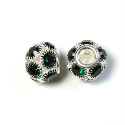 Rhinestone Bead with Large Hole Silver Plated Center - Round 14MM EMERALD SILVER